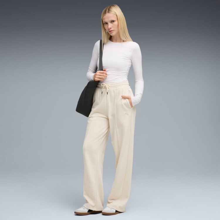 Dámske šikoré tepláky PUMA jednoduchého vzhľadu. Štandardne dlhé tepláky so stredne vysokým pásom širokého strihu, ktorý je však dostatočne voľný v oblasti stehien. Tepláky sú doplnené šikokým elastickým pásom, bočnými vreckami a logom PUMA na prednej strane. Sú vyrobené z mäkkéj štrukturovanej bavlny a polyesteru s dôrazom na ekologicku udržateľnosť .