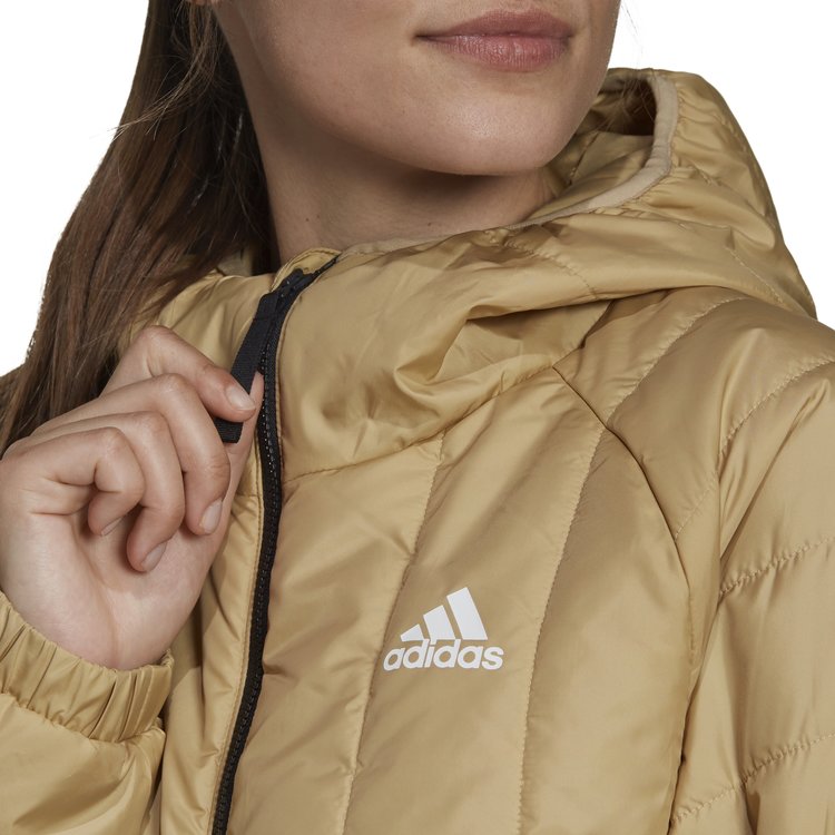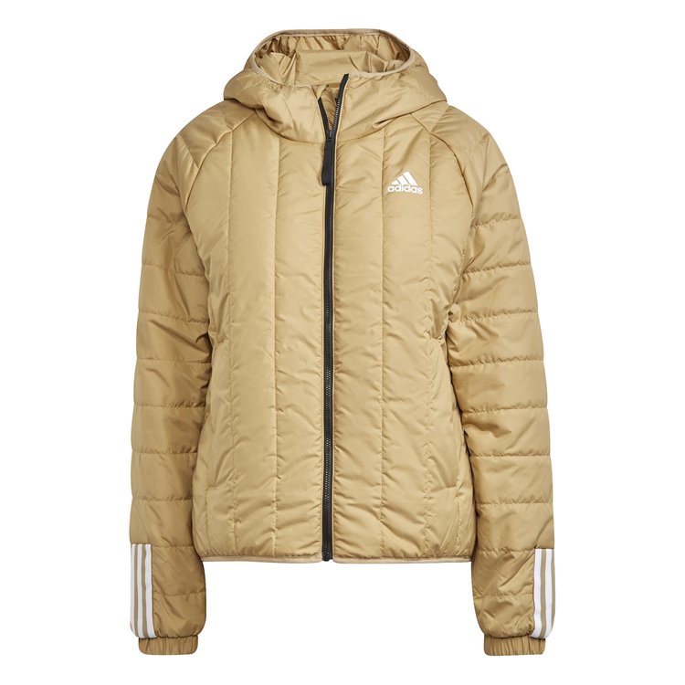 Dámska mestská bunda do chladného počasia značky adidas. Štýlová prešivaná bunda zateplená syntetickou výplňou pre dokonalý pocit tepla a pohodlia. Vonkajší materiál bundy je vyrobený z vodoodpudivého recyklovaného polyesteru. Bunda je doplnená bočnými vreckami so zipsom, kapucňou, nenápadným logom na hrudi a tromi pásikmi na rukávoch. Mierne zúžený strih bundy pôsobí moderne.